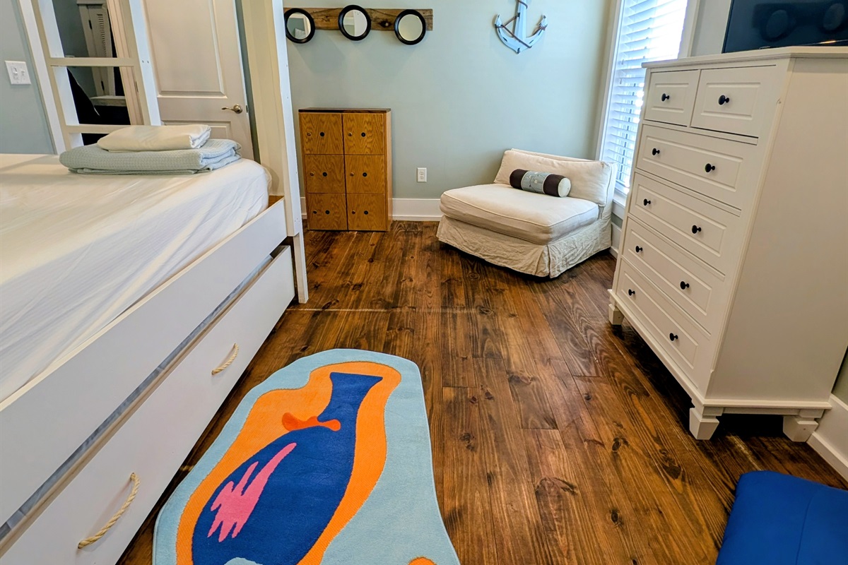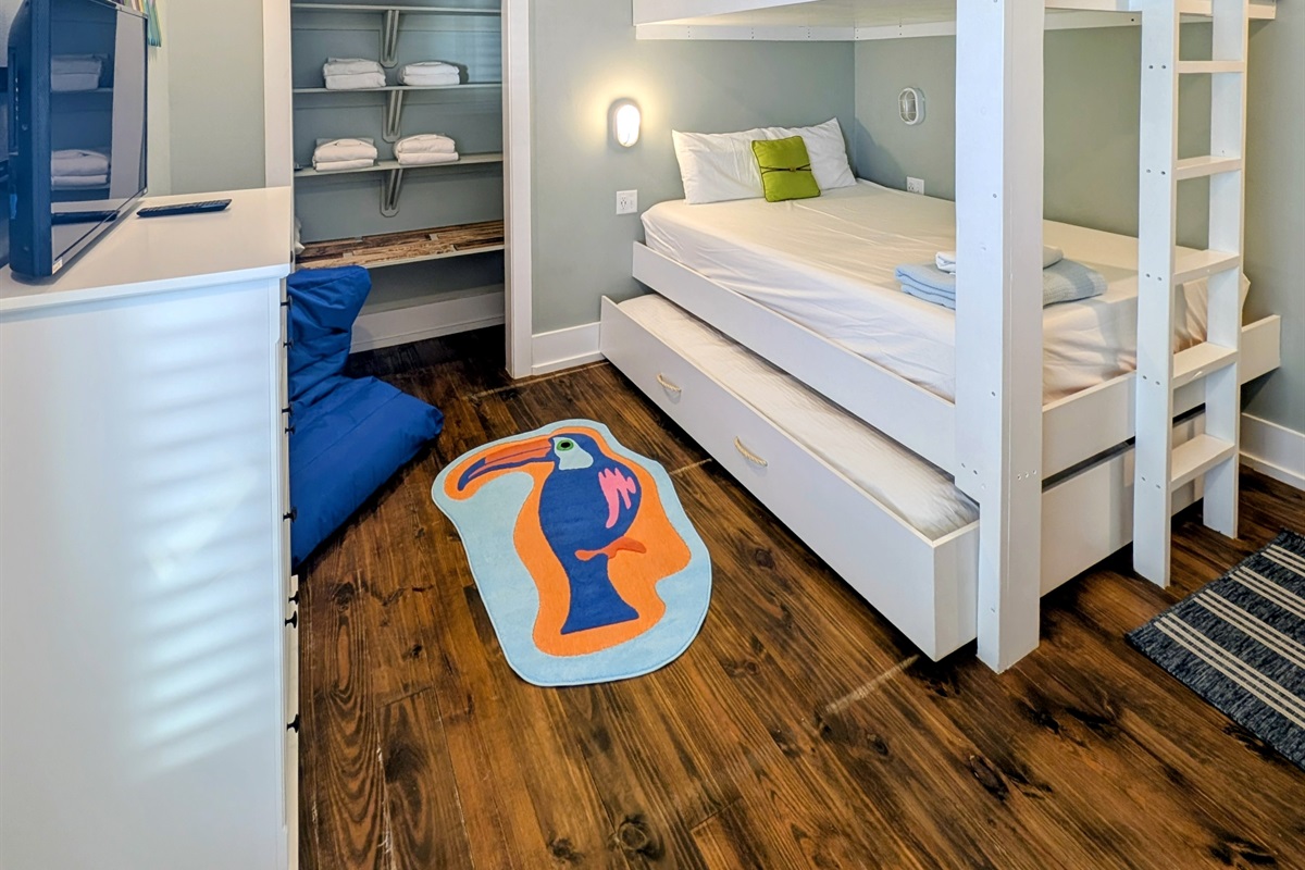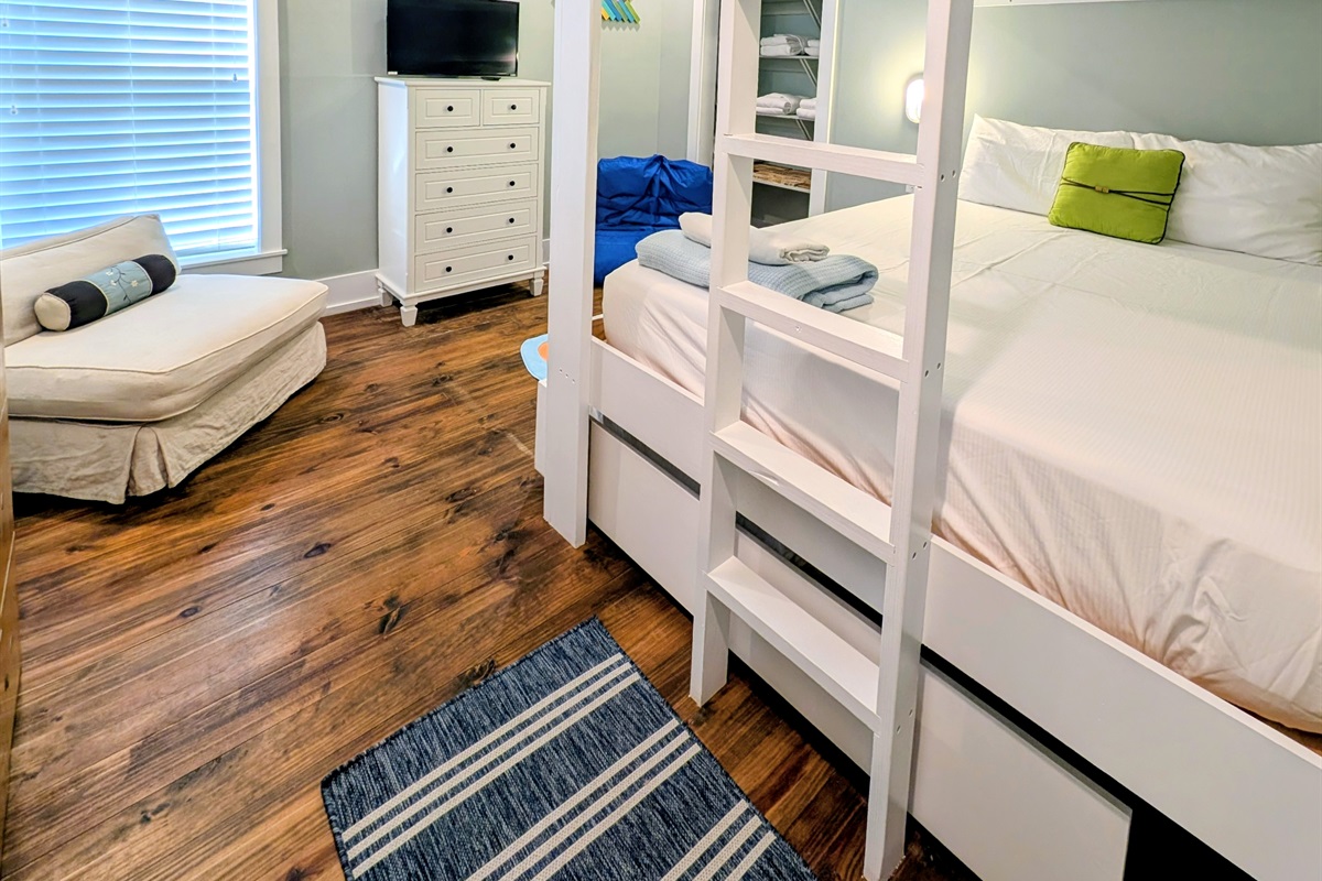 Continue your way upstairs and continue the amazing Gulf views! This top level floor offers 2 more king bedroom suites including one with sliding glass doors that open to the oversized deck and ocean views in every direction, 1 queen bedroom suite with a private bath including a large walk in shower, 1 wood, custom built queen bed with Twin XL trundle and optional queen bunk if needed (3 beds sleeps up to 5), and a cute twin bunk room for the kids. There is also a sleeper sofa in the common area on the third floor for any overflow sleepers.
