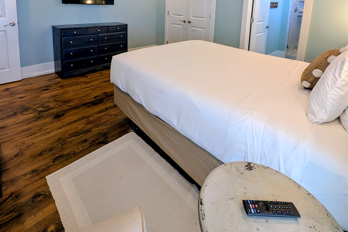 Located on the second level is the large, open concept gourmet kitchen, spacious living and dining areas which flow together with seating for 14 at the dining table, 7 more seats at the island bar and if you have more than 21 eating together. The outdoor deck seating offers tables so you can also dine alfresco! This way the entire group can dine in the same space. That common space is also large enough with a huge dining table (seats 12-14) and large screen TV ideal for conducting corporate/business meetings including the use of a projector. On the second floor you will also find a laundry room, 2 king suites with their own spa like bath both with separate walk-in showers and luxury finishes. One of the kings shares the common area full bath but is connected directly for private access.